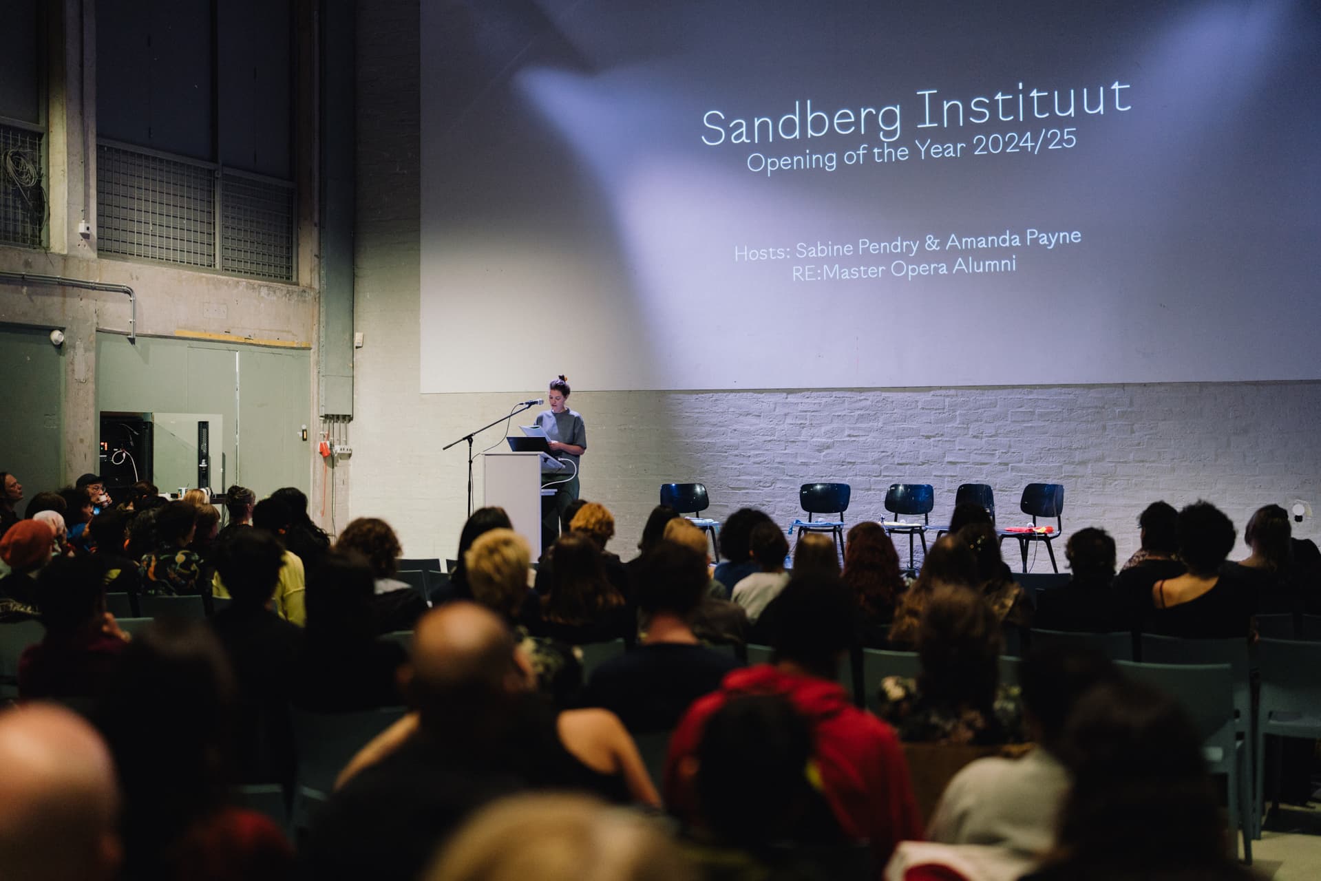 On the 25th of September we celebrated the opening of the year in the Rietveld Gym. There were panel conversations with the heads of departments, moderated by Flavia Dzodan, performances by Sandberg Instituut alumni ghenwa noiré and Alec Mateo. Our hosts of the day were Sabine Pendry & Amanda Payne, alumni of the temporary programme Re:Master Opera, who showed scenes of their graduation work.